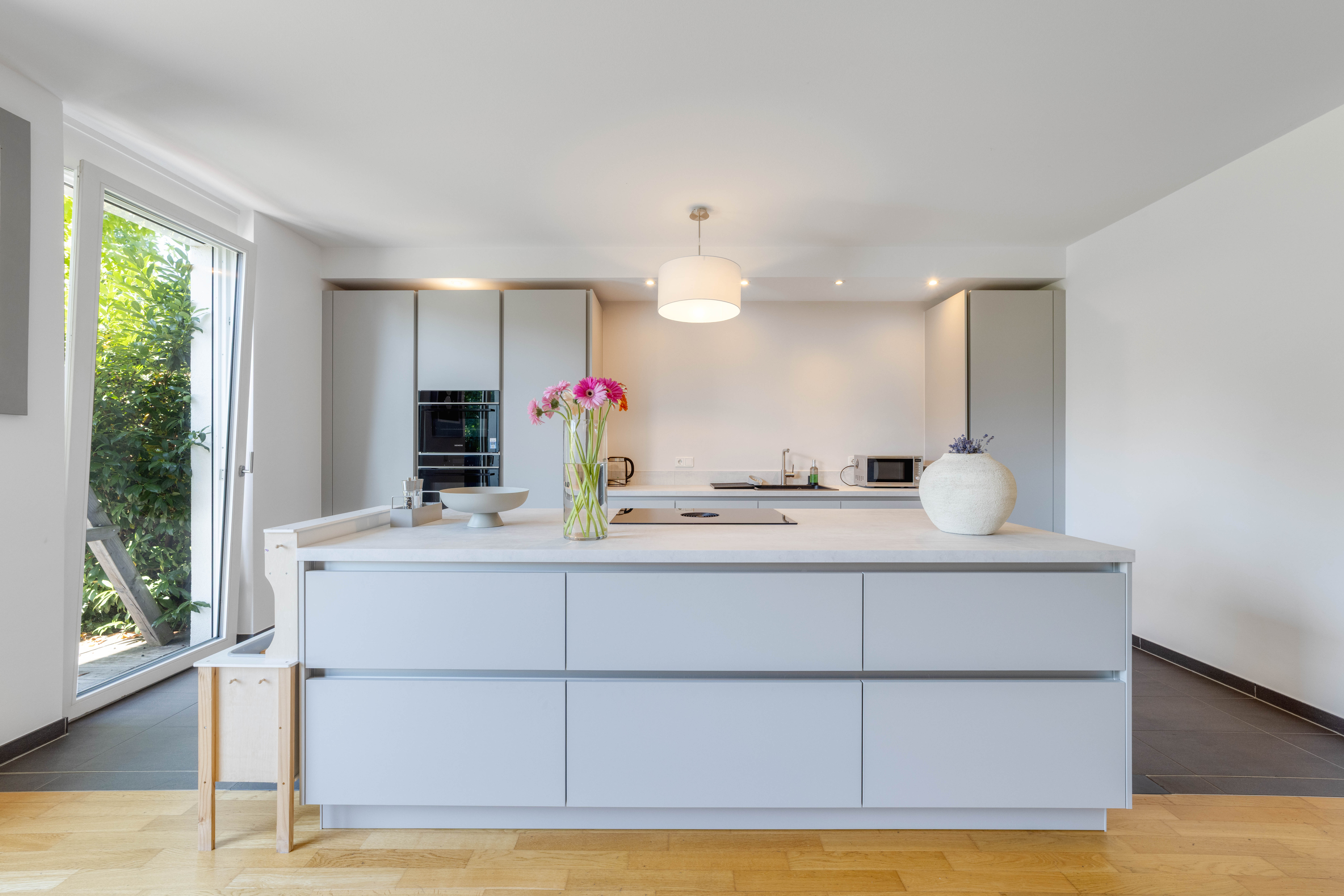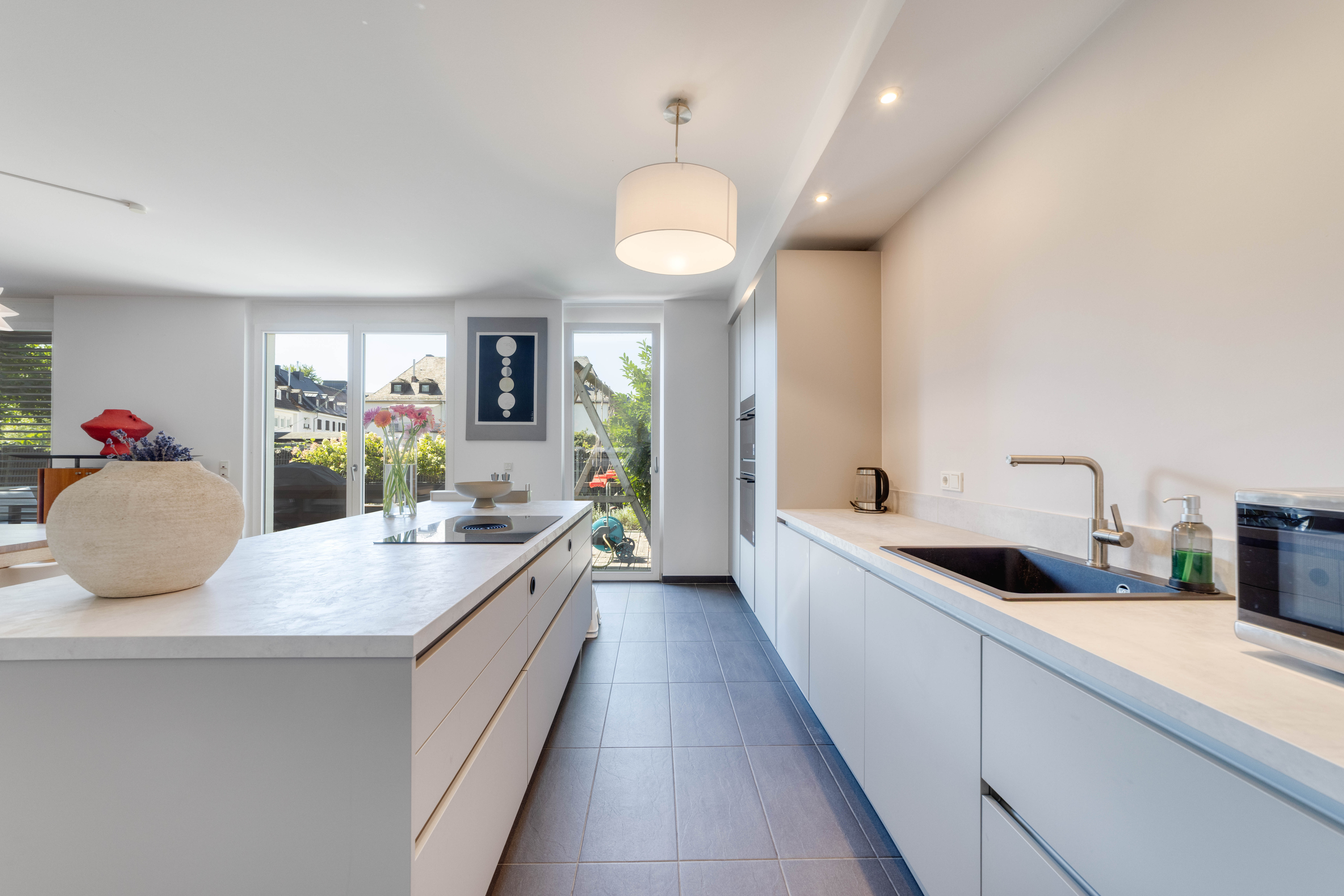 Der großzügige Wohn- und Essbereich mit offener, neuwertiger Einbauküche bildet das Herzstück der Wohnung. Durch die bodentiefen Fenster entsteht eine helle, einladende Atmosphäre, die nahtlos in den Außenbereich übergeht. Von hier aus gelangen Sie direkt auf die großzügige Terrasse, die zu entspannten Stunden im Freien einlädt.