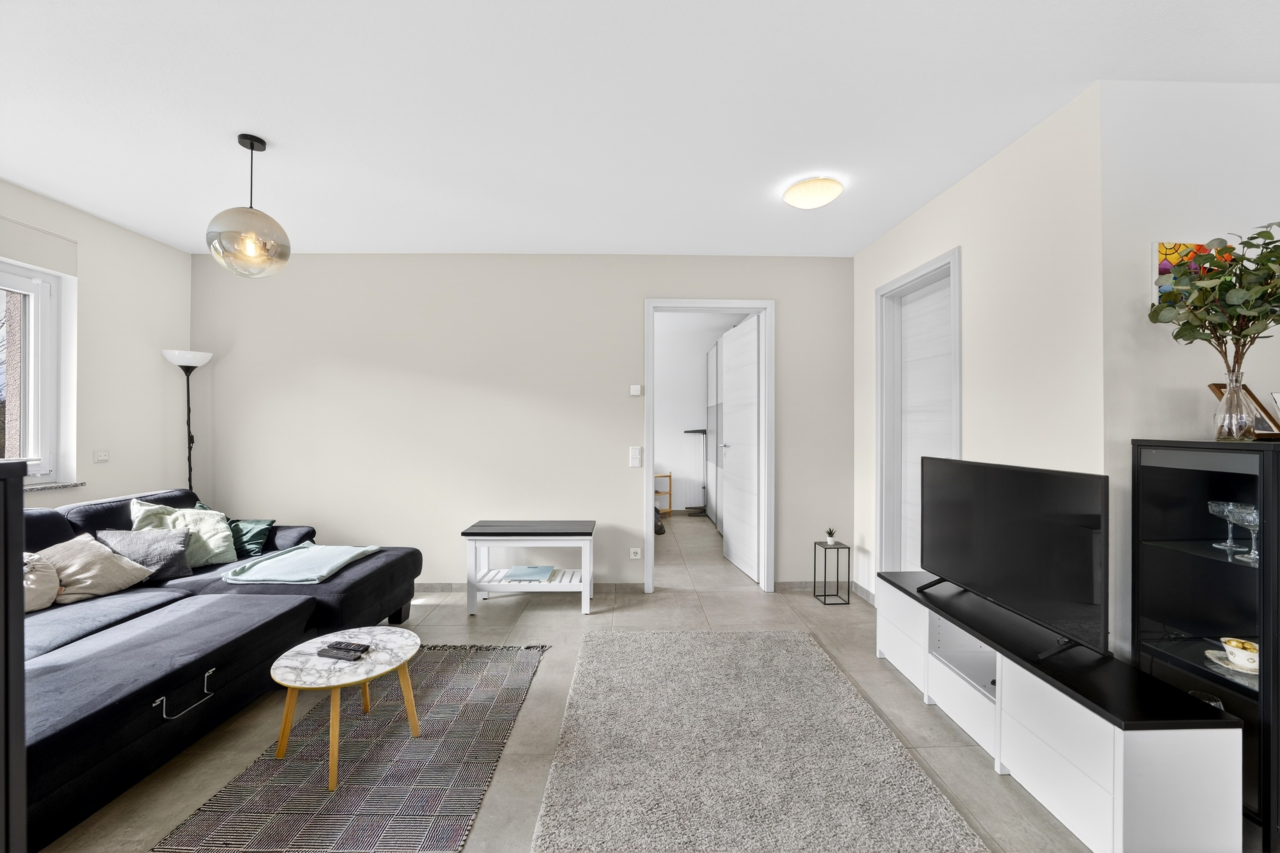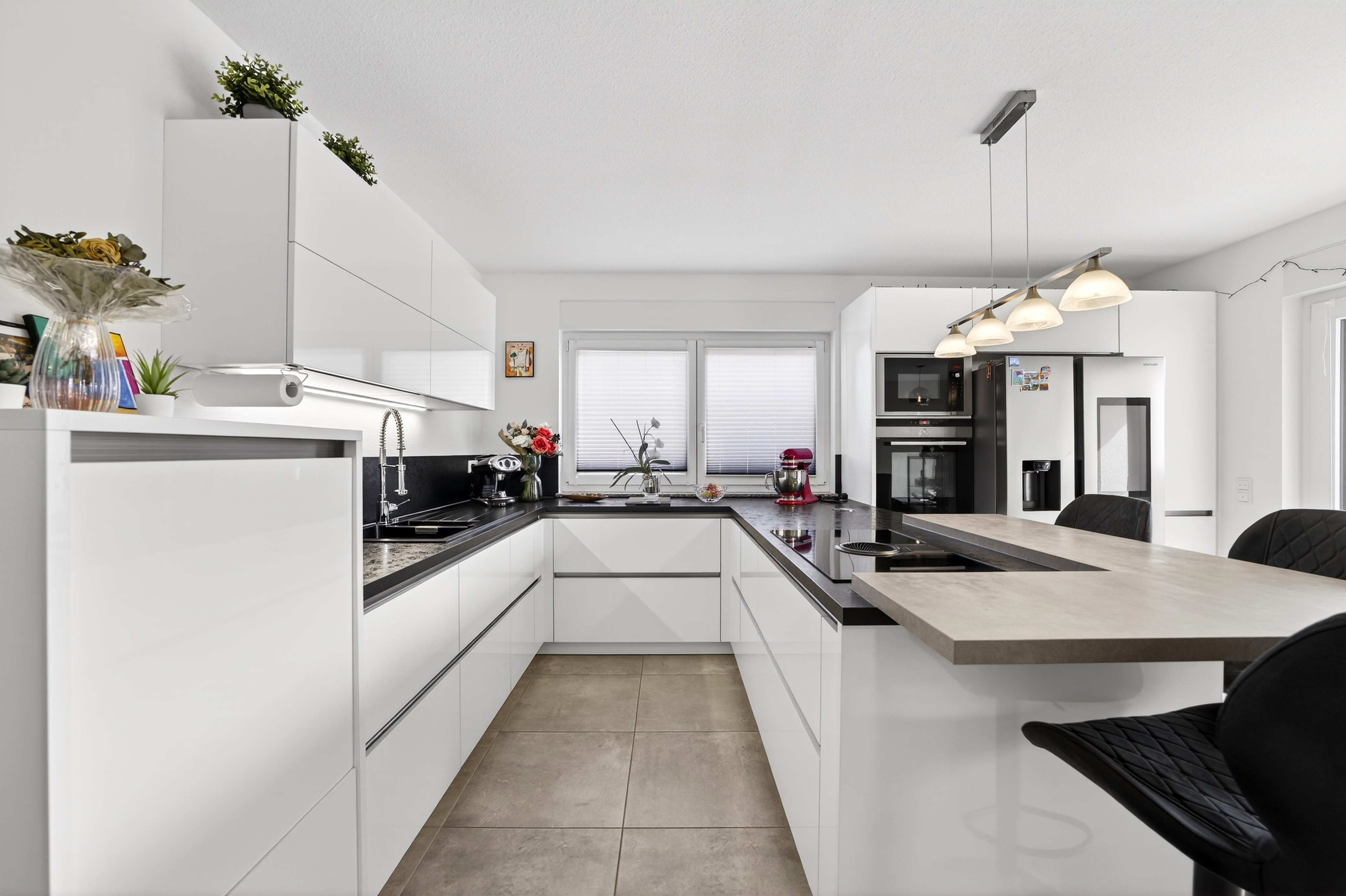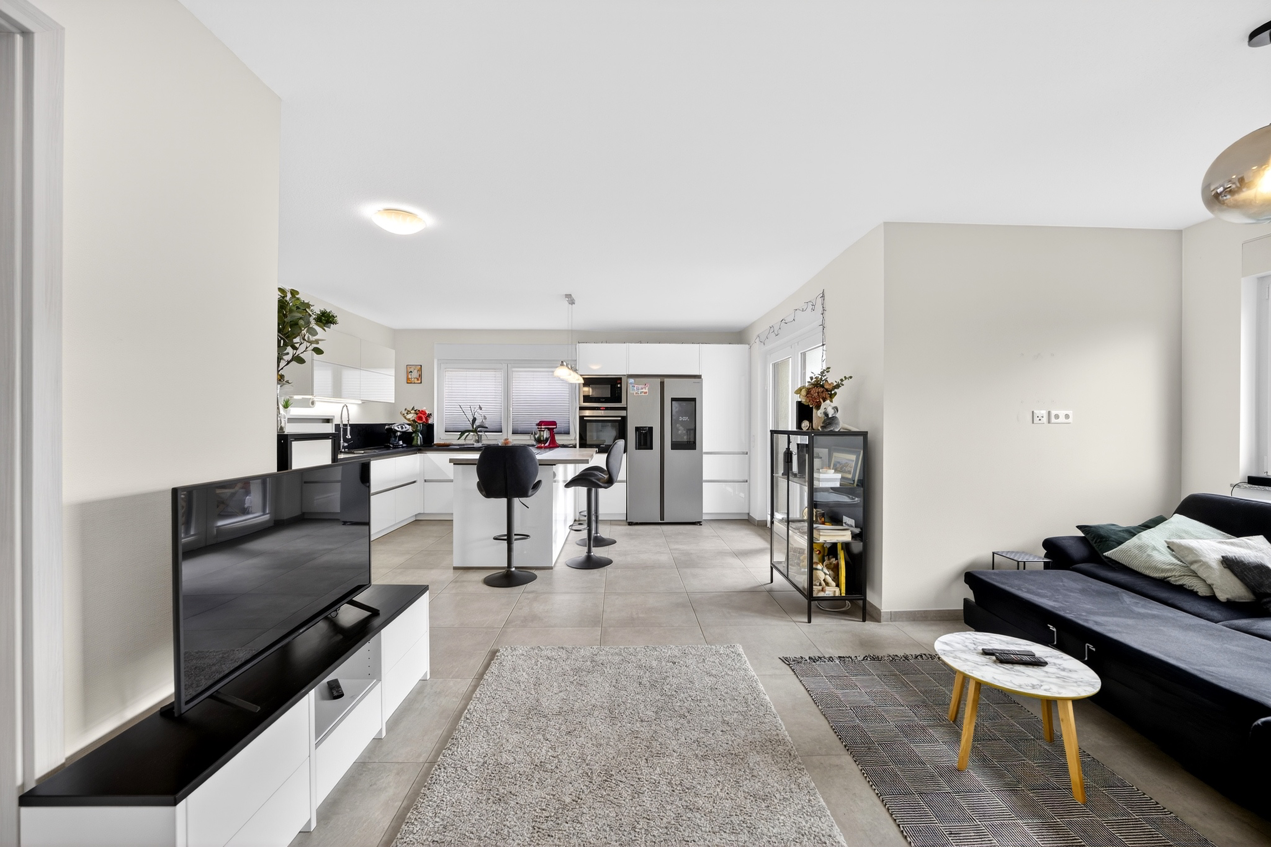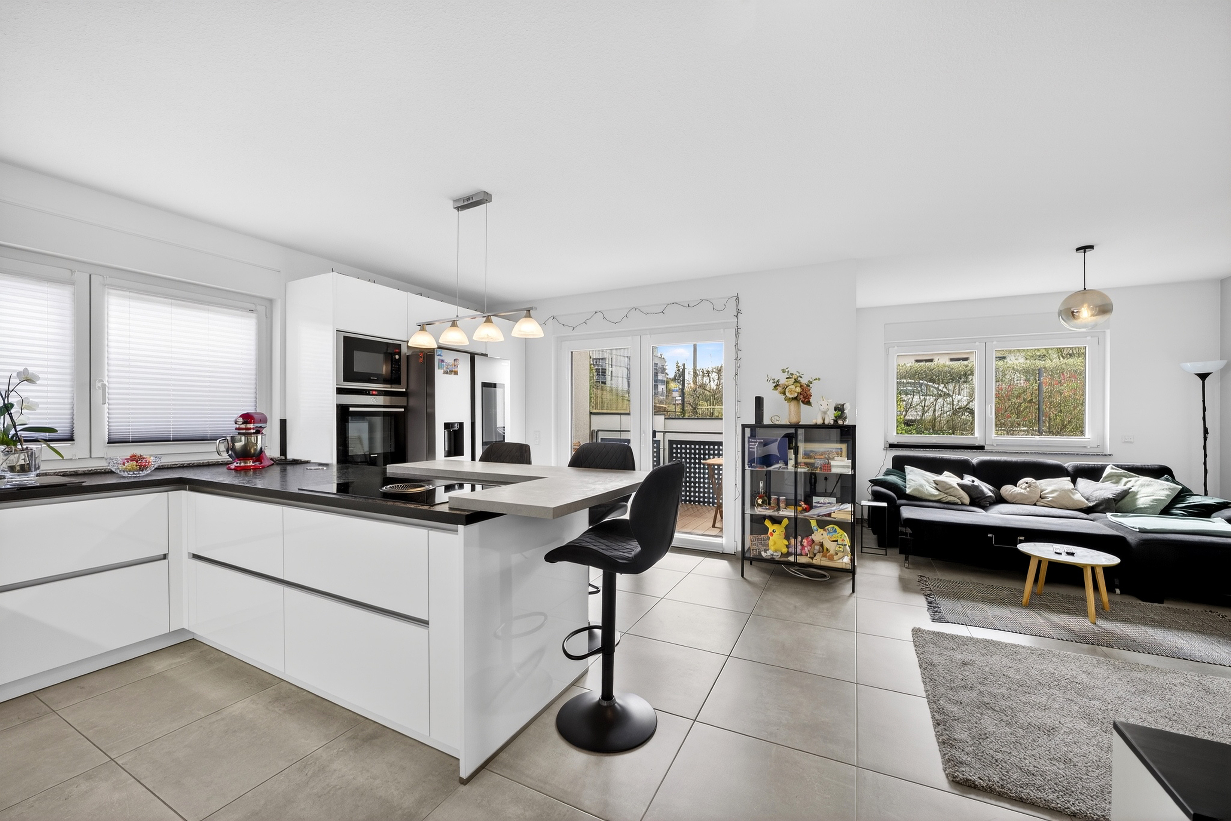 Auf ca. 64 m² Wohnfläche erwartet Sie ein offenes Wohnkonzept: Der großzügige Wohn- und Essbereich mit integrierter, offener Küche bildet das Herzstück der Wohnung. Die vorhandene Einbauküche ist bereits im Kaufpreis enthalten und fügt sich harmonisch in das moderne Gesamtbild ein.